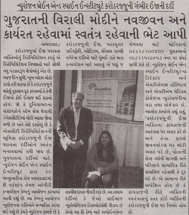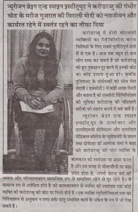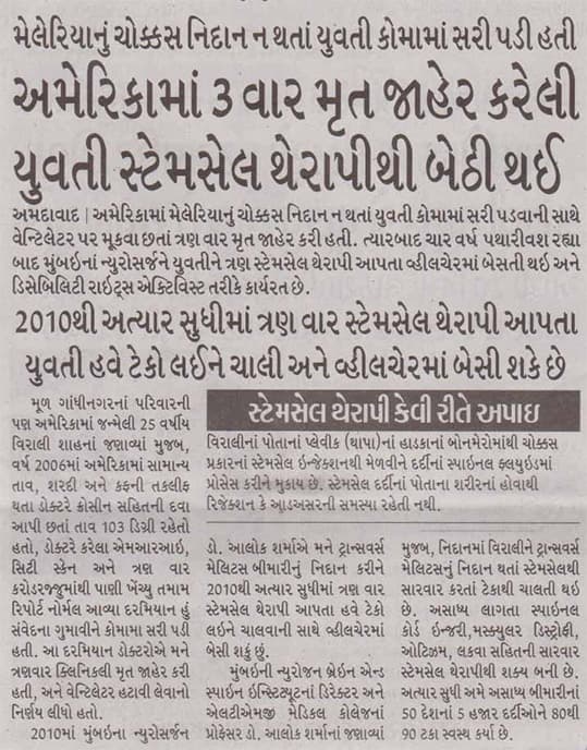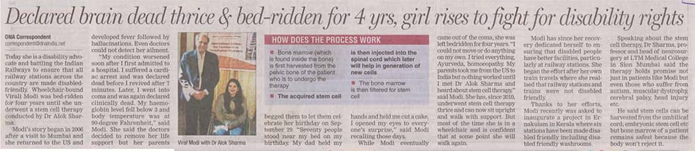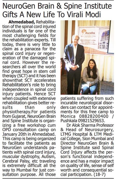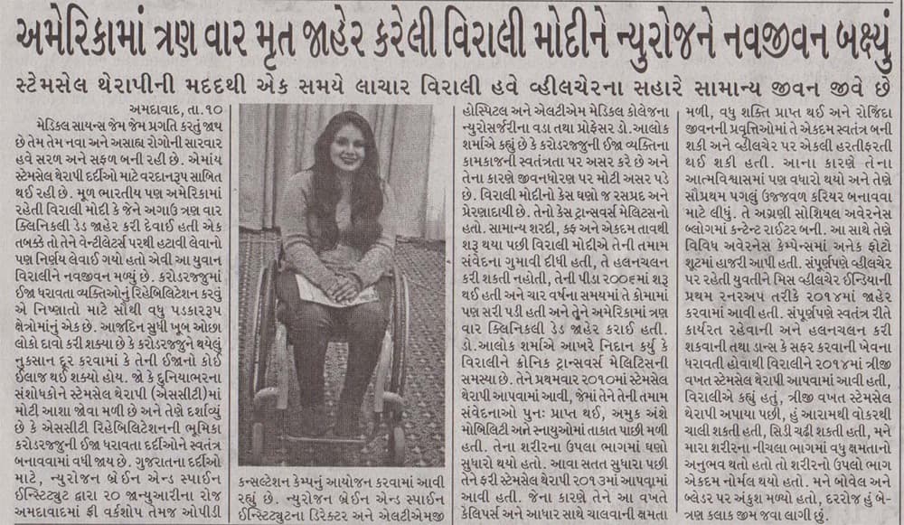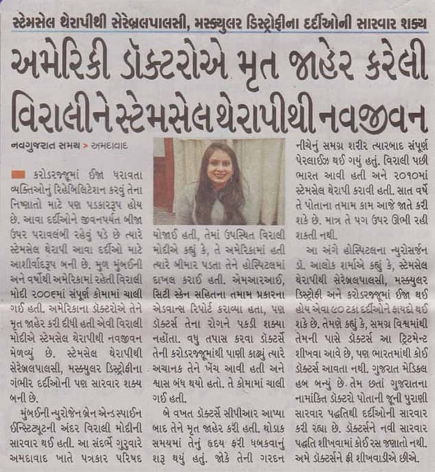 When Virali’s family brought her to Mumbai, highly acclaimed Indian Neurosurgeon & the Director at NeuroGen Brain and Spine Institute, Dr. Alok Sharma, finally diagnosed Virali as suffering from chronic Transverse Myelitis. She underwent her first cell therapy in 2010. After the cell therapy and intensive neurorehabilitation program, she regained some sensations, some mobility and strength in her muscles. Her upper limb function also improved tremendously. After experiencing consistent improvements she underwent Cell Therapy for the second time in 2013. This time she was able to start walking with calipers and support. She gained more strength, and become totally independent in terms of her activities of daily living. She was even able to travel alone on wheelchair.